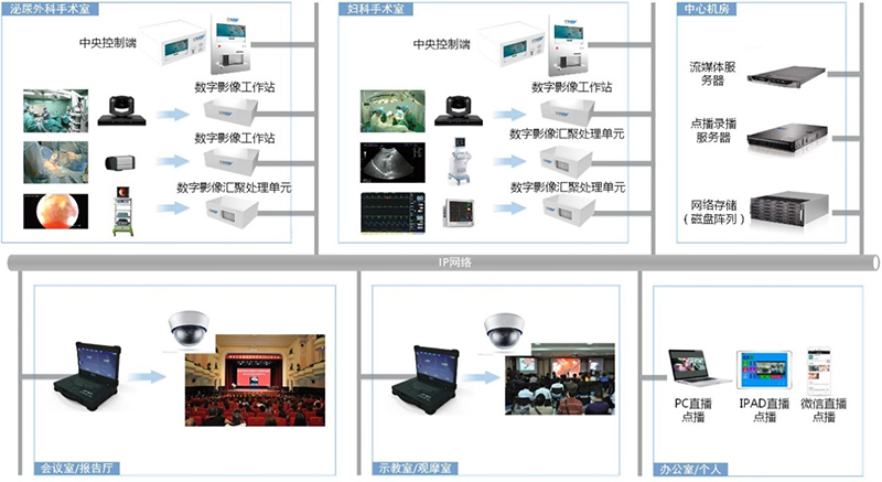 手术室是学习系统的信息源,手术现场情景、手术结果和医生现场的语言是教学中的主要元素,在手术室通常部署3台或多台高清编码终端,其将手术室的多路视频或医疗设备信号采集编码,并适时传输到示教室、观摩室和远程会诊专家。 示教室为较多的客户提供一个集中观摩学习、交互答疑的环境,通常安装大屏幕显示设备,如多台投影机、平板电视等。 示教终端从网络上将高清音视频解码并直接输出到大型显示设备上,用户能灵活切换现场手术视频画面、控制云台和摄像头,方便地组合显示多路的手术视频画面并支持双向语音对讲。 导播平台可以方便地把不同视频信号展示给专家和学习者,控制示教进程,控制手术室的摄像机,从不同角度展示手术关键内容,达到手术教学的目的。 办公室人员在取得授权的情况下可以使用电脑浏览器远程登录手术示教平台,收看手术直播,可以利用收看客户端申请与手术室语音对讲,同时也可以作为专家对年轻医生进行远程手术指导的手段,对培养和提升年轻医生的技术水平有很大帮组。 在控制室部署录播服务器、存储设备、导播平台,为所有播放端提供直播、点播服务,协调全部安全策略,统一将音视频文件集中存储在服务器端,管理员可以手动调度。